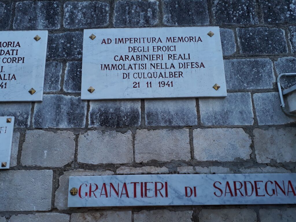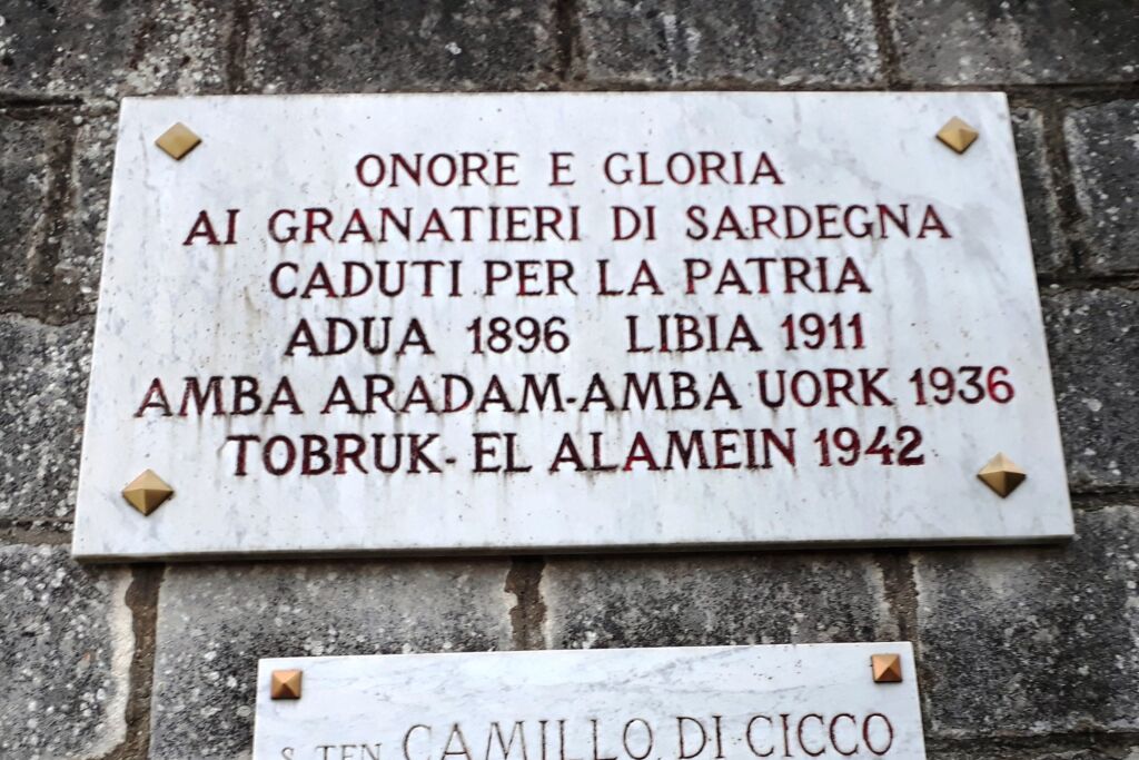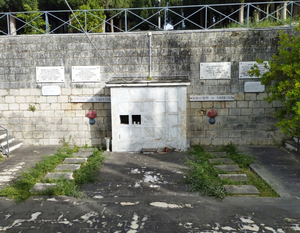 - da una parete di blocchi di pietra rettangolari su cui sono affisse due lastre con l'intitolazione ai Granatieri di Sardegna e 6 lastre di commemorazione di Granatieri Caduti