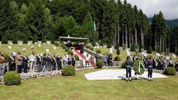 - Dietro l'altare vi sono i simboli dei vari corpi militari e dei partigiani e deportati.