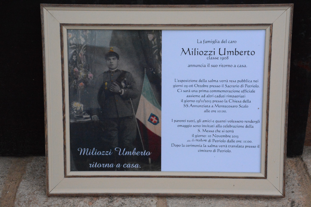 In memoria di tutti i Caduti di Petriolo, i resti di cinque militari, deceduti in varie parti del fronte sia in Italia che all’estero, sono stati riportati nel paese di origine e messi in urne di marmo bianco con  foto e scritte in rilievo.