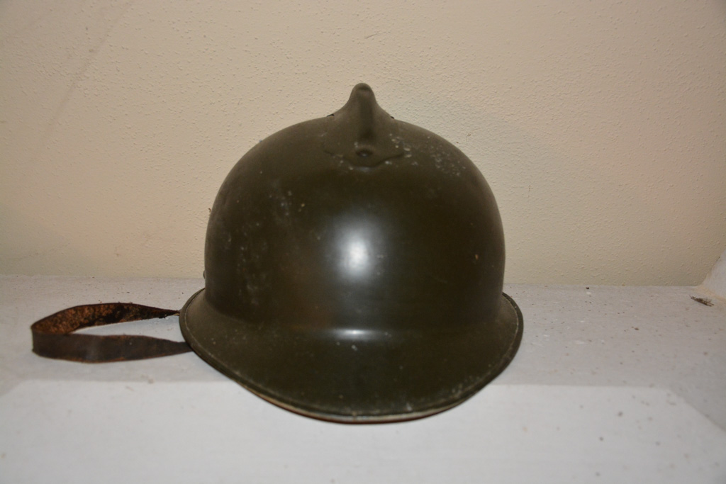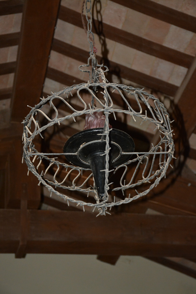 All'interno elmetti, un lampadario fatto con il filo spinato.