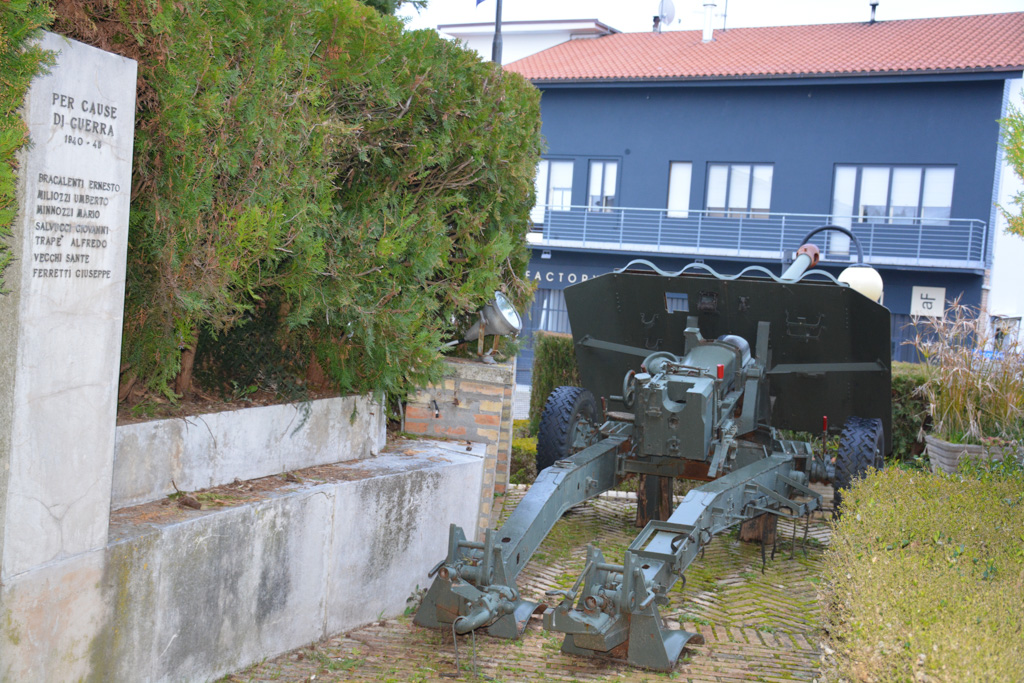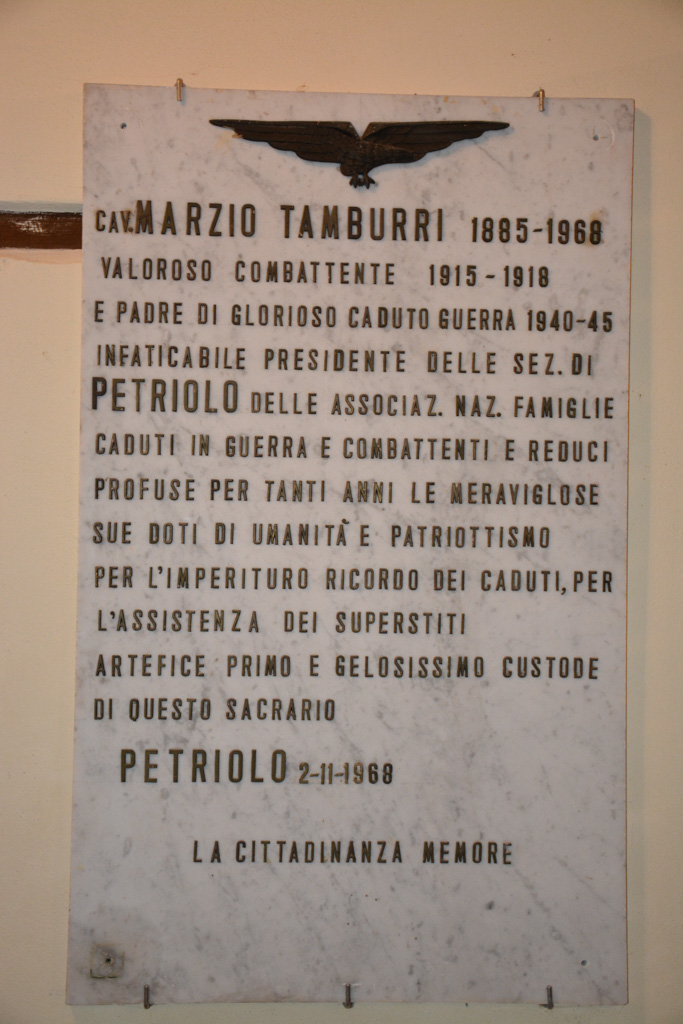 La lastra ricorda Marzio Tamburri, valoroso combattente della prima guerra mondiale, padre di un Caduto della seconda guerre mondiale ed operoso presidente dell’Associazione Nazionale Famiglie Caduti in guerra.