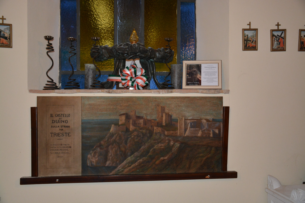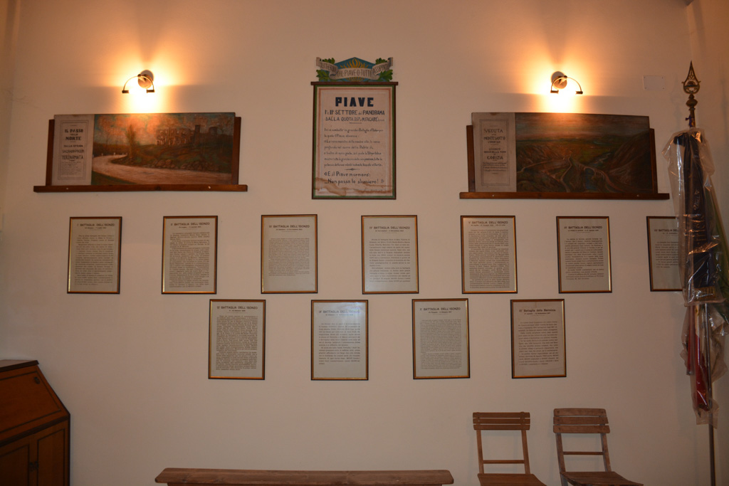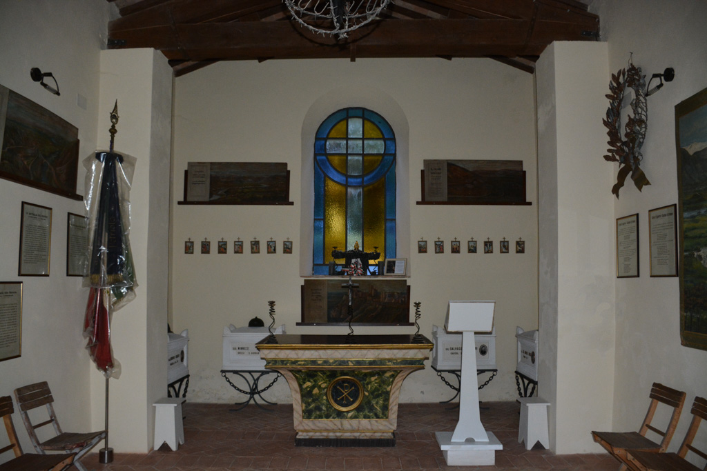 All'interno: quattro urne in marmo con elemtto appoggiato sopra; lastra in marmo, simboli, quadri, bandiera, un pò di tutto quello che ricorda il sacrificio ed i luoghi di coloro che sono caduti per un ideale o per difendere il nostro paese.