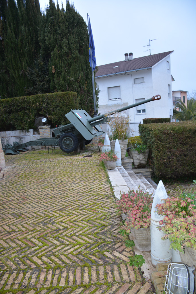 Edificio fatto a mattoncini con all'esterno cannone, proiettili.