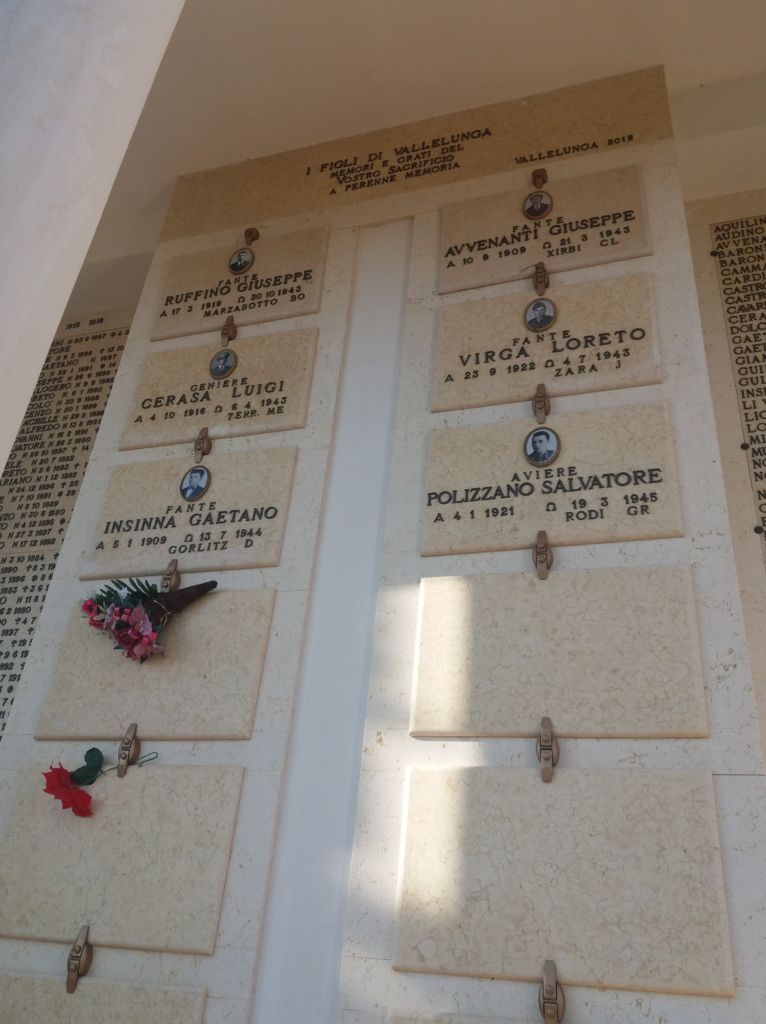 L’iniziativa di costruire un Sacrario comunale a Vallelunga Pratameno nasce nel 2008, quando la sig.ra Angela Polizzano, avvalendosi delle ricerche storiche e della collaborazione dello studioso Giuseppe Piraino, riesce a riportare in paese la salma dello zio, l’aviere Salvatore Polizzano, sepolto presso il Sacrario “Caduti d’Oltremare” di Bari. Il desiderio di riportare in paese anche le salme di altri soldati venne condivisa sia dall’amministrazione comunale e, in particolare, dal sindaco allora in carica, dott. Giuseppe Montesano, sia da altri cittadini che diedero vita a un comitato, formato dalla stessa Angela Polizzano, da Giuseppe Piraino e da Michele Eremo. Dopo un lungo e faticoso lavoro di ricerca da parte del suddetto comitato, sono stati rintracciati in vari sacrari le salme di altri soldati di Vallelunga e precisamente: Avvenanti Giuseppe nel Sacrario di “Santa Chiara” di Enna; Cerasa Luigi nel Sacrario “Cristo Re” di Messina; Insinna Gaetano nel Sacrario di Bielany in Polonia; Polizzano Salvatore nel Sacrario “Caduti d’Oltremare” di Bari; Ruffino Giuseppe nel Sacrario Militare di Marzabotto; Virga Loreto nel Sacrario “Caduti d’Oltremare” di Bari”. Nel frattempo, l’Amministrazione comunale nella persona del capoarea dell’ufficio tecnico, l’architetto Antonio Izzo, oltre ad individuare l’area da destinare alla costruzione dell’opera nella parete laterale del nuovo complesso di loculi comunali, in corso di realizzazione, ne ha curato anche la progettazione. Completati i lavori di costruzione, il 14 dicembre 2012 il Sacrario è stato inaugurato con una solenne cerimonia, in occasione della quale sono state traslate le salme dei sei soldati. Non è stato possibile far rientrare le salme di altri soldati perché sono risultati dispersi o sepolti in fosse comuni. La cerimonia si è svolta alla presenza delle massime autorità civili e militari, tra le quali, il generale di Corpo d’Armata Corrado Dalzini, comandante della Regione Militare Sud e il Generale Giuseppe Vilardo, originario di Vallelunga. Alla cerimonia hanno partecipato anche le scolaresche e numerosi cittadini. A conclusione dell’evento, le bandiere che ricoprivano le urne delle sei salme dei soldati sono state consegnate ai rispettivi parenti ed è stata donata ai cittadini presenti un copia della Costituzione della Repubblica Italiana. È da sottolineare che l’intera iniziativa è stata possibile, oltre ai contributi personali dei membri del Comitato e del Sindaco, grazie alla generosità di diversi cittadini.