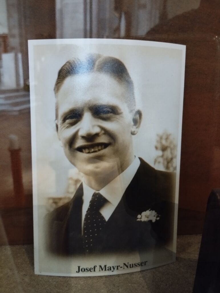 - Josef Mayr-Nusser nacque il 27 dicembre 1910 al Maso Nusser (Nusserhof) ai Piani di Bolzano. Dopo le scuole commerciali lavorò come contabile a Bolzano. Di profonda fede cattolica, i suoi riferimenti furono san Tommaso d’Aquino, san Tommaso Moro e Peter Mayr, patriota tirolese che combattè durante l'Insorgenza Tirolese nel 1809 e che, una volta catturato, preferì morire piuttosto che mentire per avere salva la vita. Nel 1932 Josef entrò a far parte della Conferenza di San Vincenzo di Bolzano. Nel 1934 fu nominato presidente della sezione maschile dei giovani di Azione Cattolica della cosiddetta "parte tedesca" dell'Arcidiocesi di Trento. Quando nel 1937 fu fondata una Conferenza di San Vincenzo ai Piani di Bolzano, ne fu nominato presidente. Nel 1939, durante il periodo delle Opzioni in cui fu chiesto agli altoatesini di scegliere se diventare cittadini tedeschi e trasferirsi nei territori del Terzo Reich o se rimanere cittadini italiani, Josef Mayr decise di rimanere nella sua terra, a differenza della maggioranza degli altoatesini. Il 26 maggio 1942 sposò Hildegard Straub e un anno dopo nacque il figlio Albert. Dopo l'armistizio del settembre 1943, l’Alto Adige fu occupato dalle truppe tedesche. Nel settembre del 1944 Josef fu arruolato nelle SS, un atto contro il diritto internazionale dato che egli aveva scelto di mantenere la cittadinanza italiana. Con altri 80 altoatesini giunse a Konitz nella Prussia occidentale. Josef partecipò al periodo di addestramento nelle SS combattenti, ma il giorno prima del giuramento dichiarò che, per motivi di coscienza, non avrebbe potuto prestarlo. Egli fu consapevole che quel rifiuto gli sarebbe costata la vita, ma la sua coscienza cristiana gli proibì di agire in altro modo. Dichiarò: “È meglio perdere la vita piuttosto che abbandonare la via del dovere” e “Se nessuno ha mai il coraggio di dire loro che non è d’accordo con le loro visioni nazionalsocialiste, allora non cambierà mai niente”. Josef fu condannato a morte dal tribunale di Danzica con l’accusa di disfattismo. Il treno che lo portava a Dachau dovette sostare nei pressi di Erlangen per otto giorni a causa dei binari distrutti. A Erlangen Josef Mayr morì di stenti il 24 febbraio 1945 in un vagone bestiame. Josef Mayr-Nusser fu sepolto in un primo momento a Erlangen. Nel 1958 la sua salma fu riportata in Alto Adige e nel 1963 inumata nelle mura esterne della chiesa di Stella di Renon. La sua sepoltura definitiva è nel Duomo di Bolzano, dove fu proclamato beato il 18 marzo 2017.