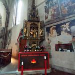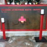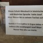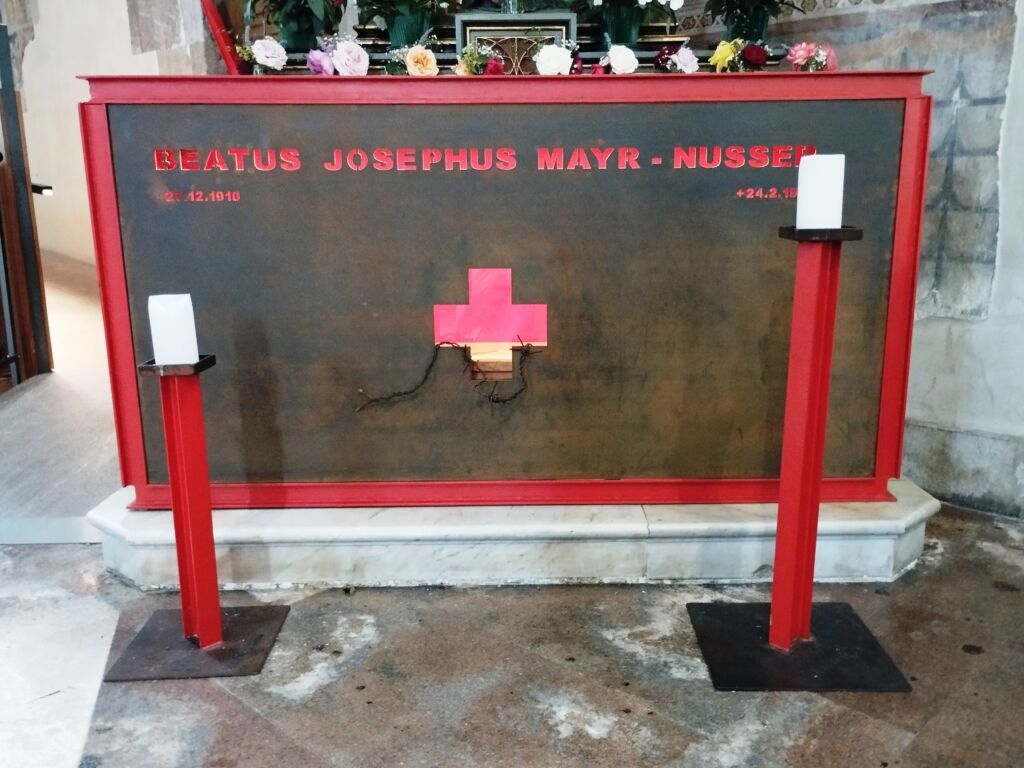 - Il sepolcro si sviluppa in un trittico costituito dal vano di un portale non più utilizzato, della mensa dell’altare che funge da custodia per i resti di Mayr-Nusser e da una nicchia nel muro del transetto sulla destra del sepolcro. Anche i candelabri che completano l’insieme sono creati con acciaio Corten e putrelle. Nella nicchia del “portale dei preti” su una grossa lastra dalla superficie arrugginita sono presenti un ritratto del beato e un breve testo informativo in quattro lingue (tedesco, italiano, ladino e inglese). L’importanza della nicchia viene sottolineata dalla putrella rossa che in alto forma un baldacchino virtuale. Nella parte mediana dell’opera, intesa come altare-sepolcro, è collocata l’urna. Questa si presenta alla vista attraverso l’apertura cruciforme sul lato frontale e attraverso il piano del tavolo, pure questo in vetro. La nicchia invece, insieme a due lamiere color ruggine e con un nastro rosso, richiama un libro aperto. Protetti da una lastra di vetro, ospita oggetti personali di Josef. Le superfici rugginose dell’acciaio Corten, insieme alle putrelle, forti e inflessibili, richiamano, sia lo stile di vita coraggioso, lineare ed eticamente retto di Josef Mayr-Nusser, sia la sua fine nel vagone bestiame, mentre veniva trasportato dai nazisti verso il campo di concentramento di Dachau. Il pezzo di filo spinato nella finestrella cruciforme sottolinea la brutalità del regime, che con violenza schiacciava la dignità umana e la libertà di pensiero. In questo lavoro il colore rosso sta per il coraggio della persona che osava andare contro corrente, staccandosi dalla massa accondiscendente.