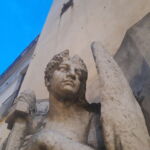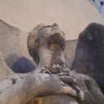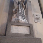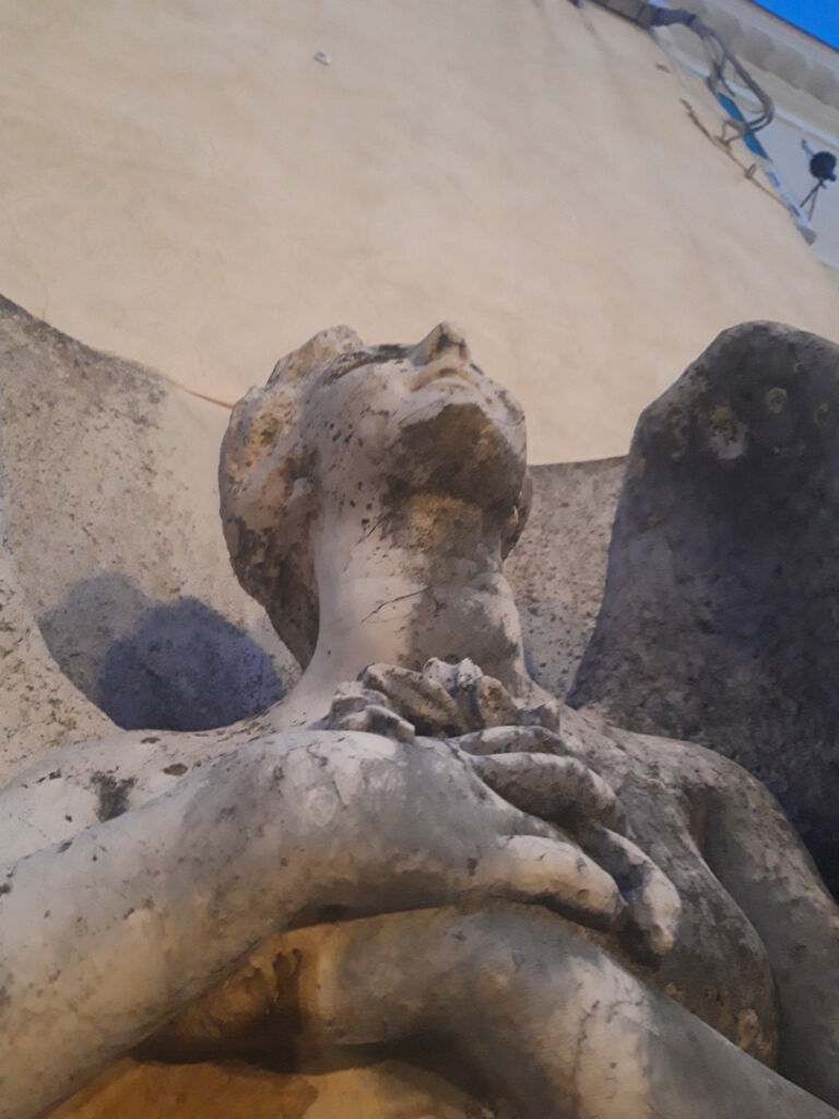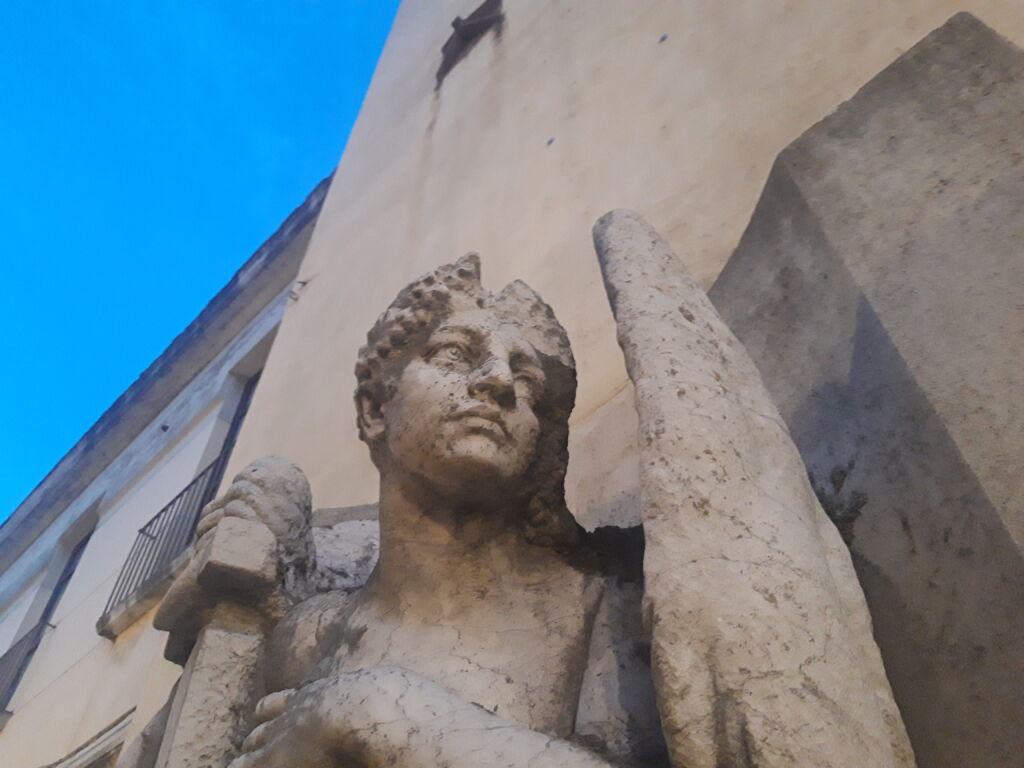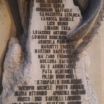 - - statue = in pietra bianca ruvida altezza circa mt 2. Solo sui corpi la pietra è levigata per consentire la puntellatura delle lettere dei nomi;