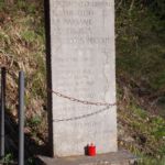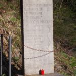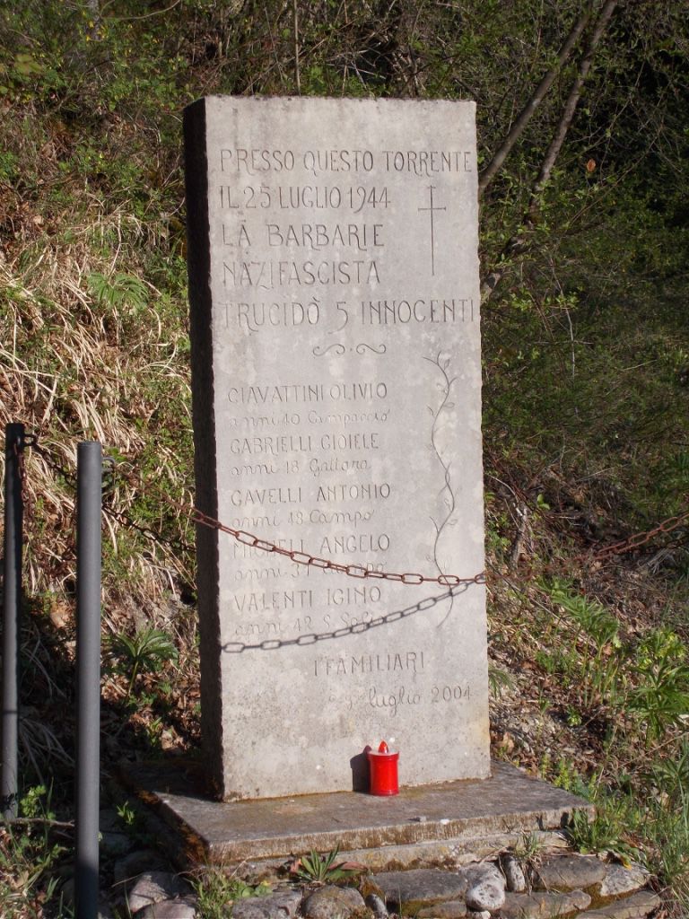 - Su una lastra in pietra si innalza un blocco dalle forme regolari. Il cippo è delimitato da paletti e catene.