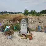 - L’attuale ha sostituito la stele originaria, caratterizzata da una stretta lastra tagliata trasversalmente nella sua parte superiore, dalla presenza della data di morte nell’epigrafe e dalle incisioni presenti nella sua parte inferiore (una lampada votiva con la fiamma e dei motivi vegetali, forse ramoscelli di alloro). L’epigrafe presente sulla stele originale recitava: