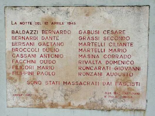 Due giorni prima della liberazione la Brigata Nera di Imola e un reparto delle Ss prelevarono numerosi prigionieri dalle carceri della Rocca e ne uccisero 16, dopo averli a lungo torturati. Erano soprattutto castellani e medicinesi: Bernardo Baldazzi, Dante Bernardi, Gaetano Bersani, Duilio Broccoli, Antonio Cassani, Guido Facchini, Mario Felicori, Paolo Filippini, Cesare Gabusi, Secondo Grassi, Ciliante Martelli, Mario Martelli, Corrado Masina, Domenico Rivalta (il solo imolese del gruppo, decorato poi con la Medaglia d'Oro al valor militare), Giovanni Roncarati, Augusto Ronzani. I cadaveri furono gettati nel pozzo dello stabilimento ortofrutticolo Becca, in via Vittorio Veneto. Per terra ci sono tanti sassi quante sono state le vittime dell'eccidio.