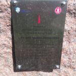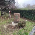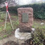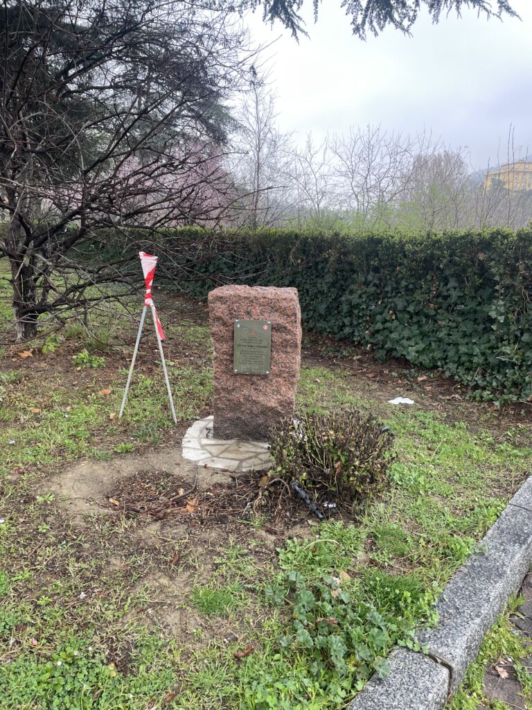 - La stele è realizzata in pietra rossa, mentre la targa è di metallo.