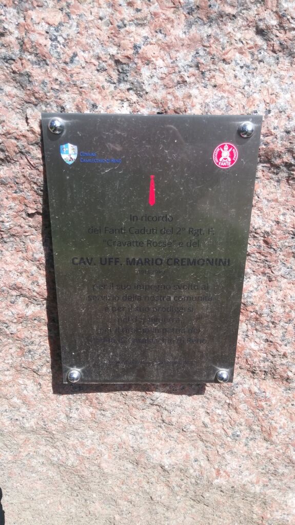 - Sulla targa sono presenti lo stemma del comune di Casalecchio, una cravatta rossa in posizione centrale, e lo stemma dell'associazione nazionale Fante.