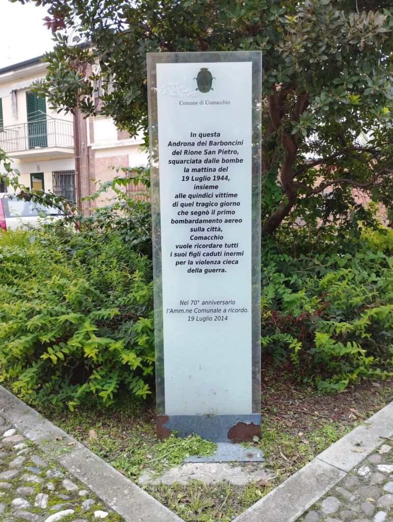 Il primo bombardamento aereo alleato su Comacchio avvenne alle 9,15 di mercoledì 19 luglio 1944. Gli aerei angloamericani, con l’intento di colpire la ferrovia, sganciarono diverse bombe sulla città. Esse caddero nell’androna Barboncini (oggi piazzetta Barboncini), presso l’antico rione di San Pietro, causando il crollo di case e seppellendo sotto le macerie 15 civili: bambini, ragazzi, adulti e anziani.