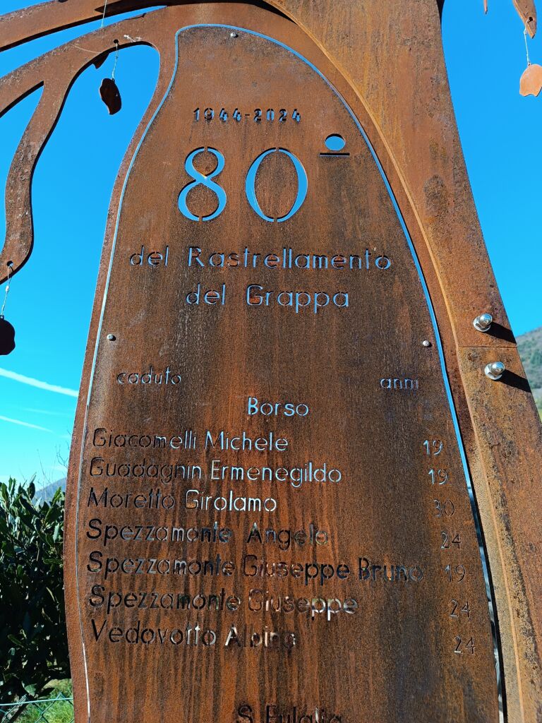 - La stele è un prodotto finale di un ampio progetto realizzato dagli alunni della Secondaria di Borso del Grappa, pensato a favore della Comunità per ricordare i Caduti di Borso nel Rastrellamento del Grappa del settembre del 1944, evento che ha colpito emotivamente i ragazzi. La loro grande sensibilità li ha portati a pensare di progettare la stele in memoria dei 27 giovanissimi Caduti di Borso, Sant’Eulalia e Semonzo nel Rastrellamento del Grappa. La stele è stata interamente ideata e progettata dagli alunni per onorarne la memoria e ricordarli per sempre, in occasione dell’ 80° anniversario del Rastrellamento del Grappa. La stele ha la forma di un albero, le cui foglie che cadono sono come questi giovani, ma le cui radici, però, ben salde, della memoria e della consapevolezza, continuano a nutrire e a far nascere nuova vita. Il fiore strappato della loro giovane esistenza ha convinto gli alunni a registrare e a incidere per sempre sulla stele anche la loro età, a monito per tutta la popolazione, ma soprattutto per i giovani, del loro sacrificio.