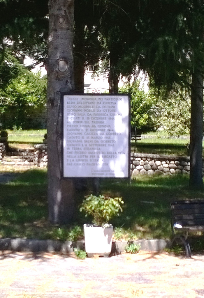 - Resti memoria dei partigiani Aldo delle Piane da Genova, Silvio Molinelli da Ottone, Giovanni Nobile da Ottone, Igino Sala da Fabbrica Curone, fucilati il 19 dicembre 1944 al ponte sul Trebbia
