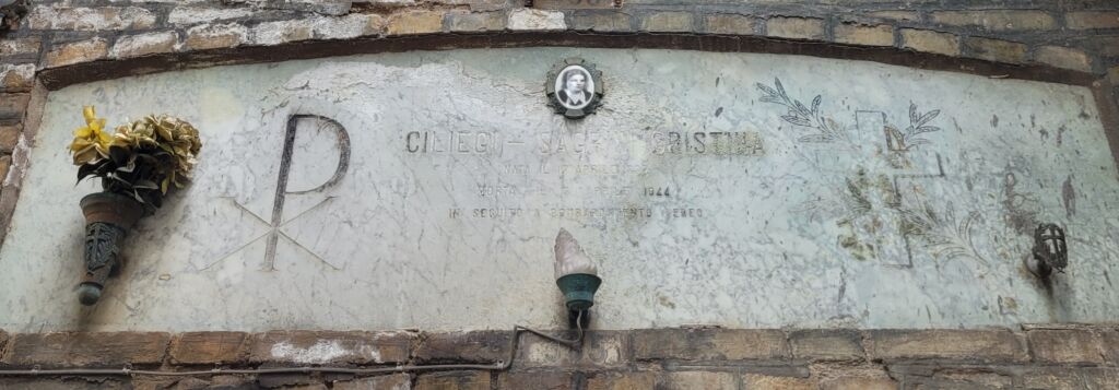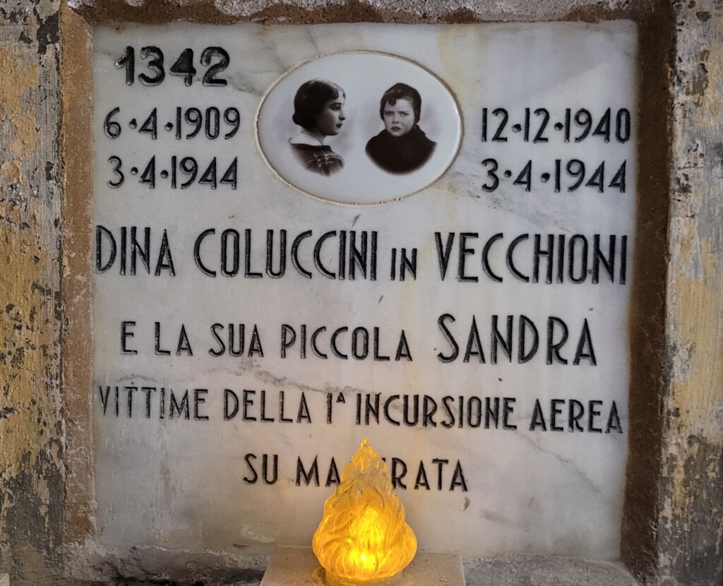 Lapide sul loculo di Cristina Ciliegi-Sagrini (Macerata, 17.04.1887-03.04.1944), vittima civile del primo bombardamento aereo alleato su Macerata. Il manufatto è di forma rettangolare con sommità centinata, in marmo lavorat ...